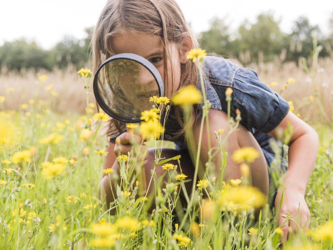 Kind bekijkt wilde bloemen in een veld met een vergrootglas tijdens lentepret.