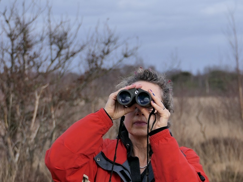 Vrouw kijkt door verrekijker tijdens de vogelexcursie in de Deurnese Peel